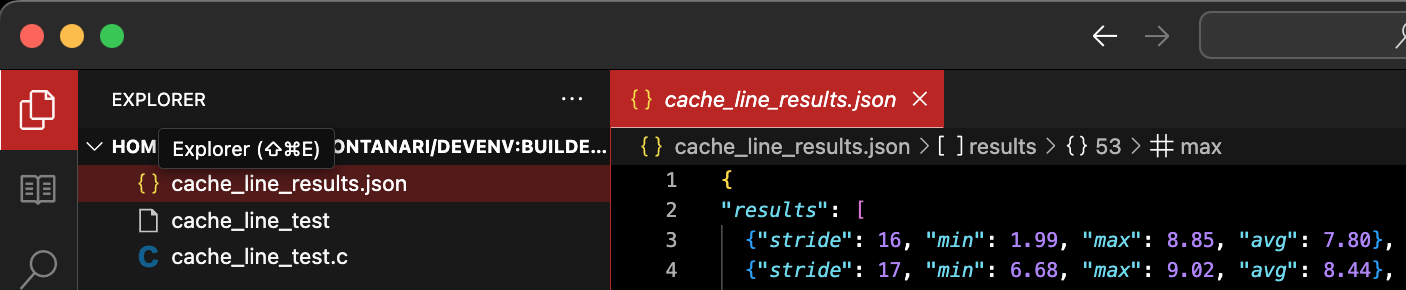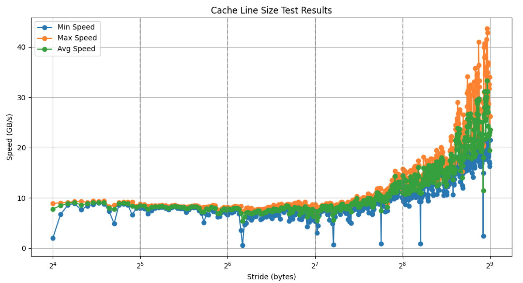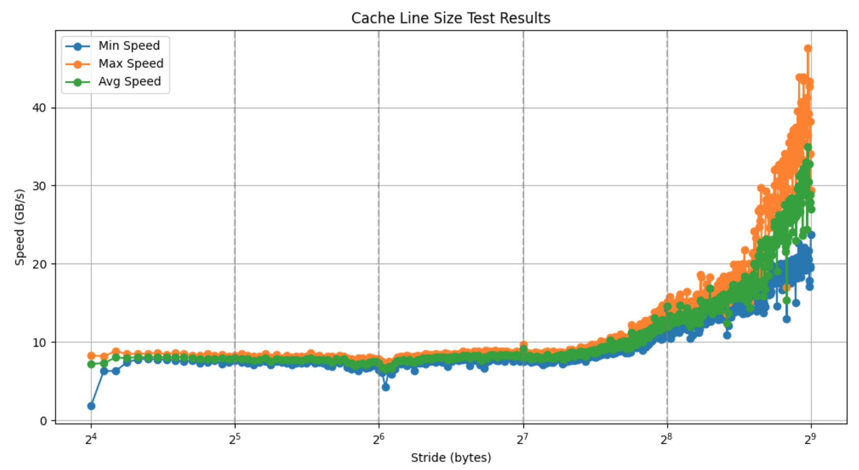 Better now! Repeating the test gives more consistent results and the cache line on my laptop seems to be 128 bytes. From common wisdom I expected it to be 64 bytes instead. Let’s do more testing.